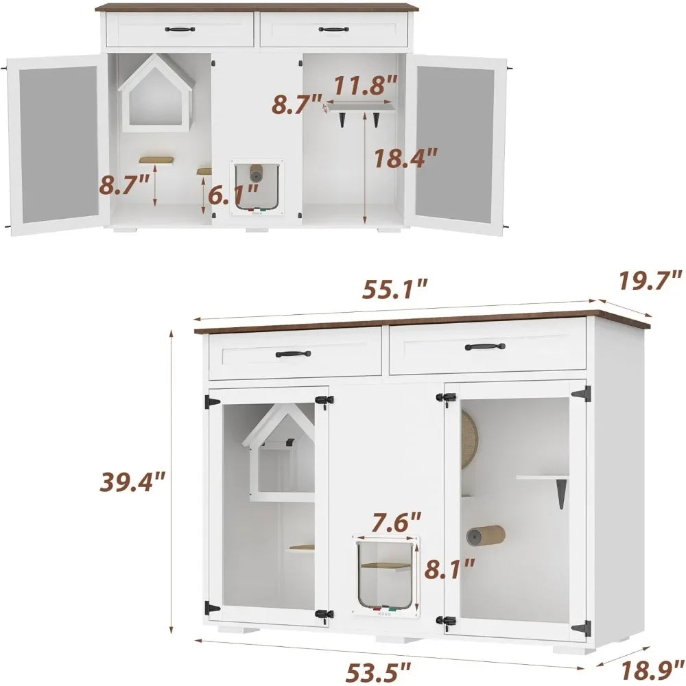 Heavy Construction: Our wooden cat cabinet is made of high quality P2-grade PB, which is strong and has long service life, the tabletop can bear up to 80lbs. The doors are made of transparent acrylic board, not easy to break and also more lightweight. Meanwhile,2 large drawers offer more storage space which are perfect to store cat supplies
