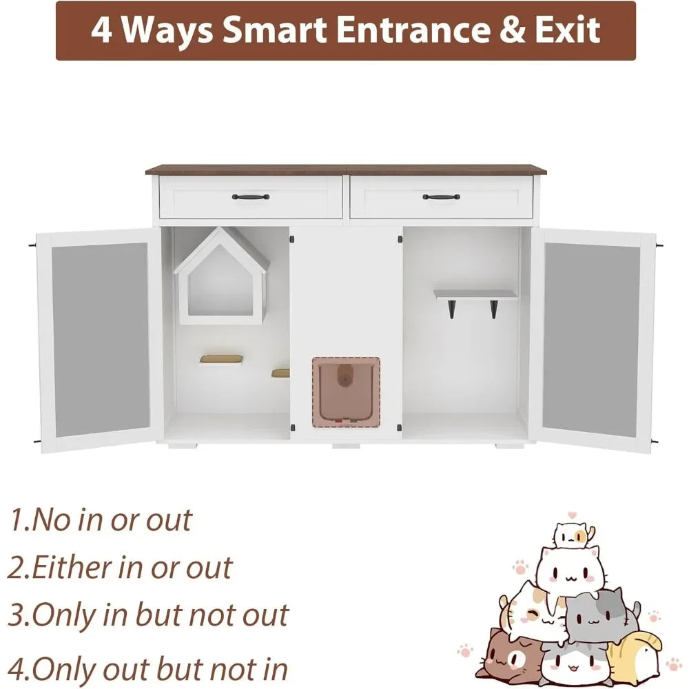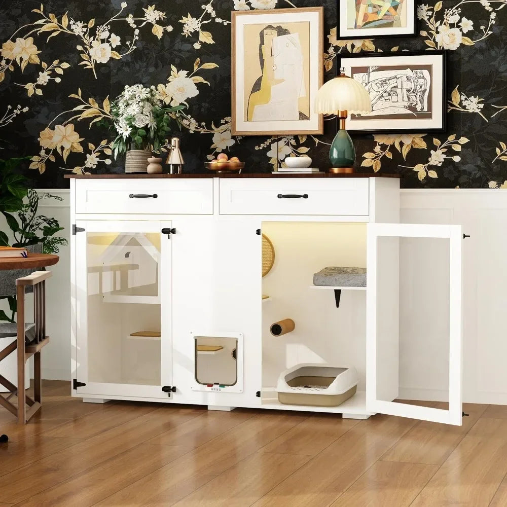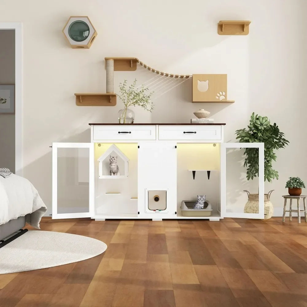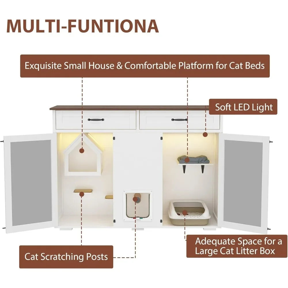 Cat Condo with Drawers, LED Light, Scratch Posts and Smart Door