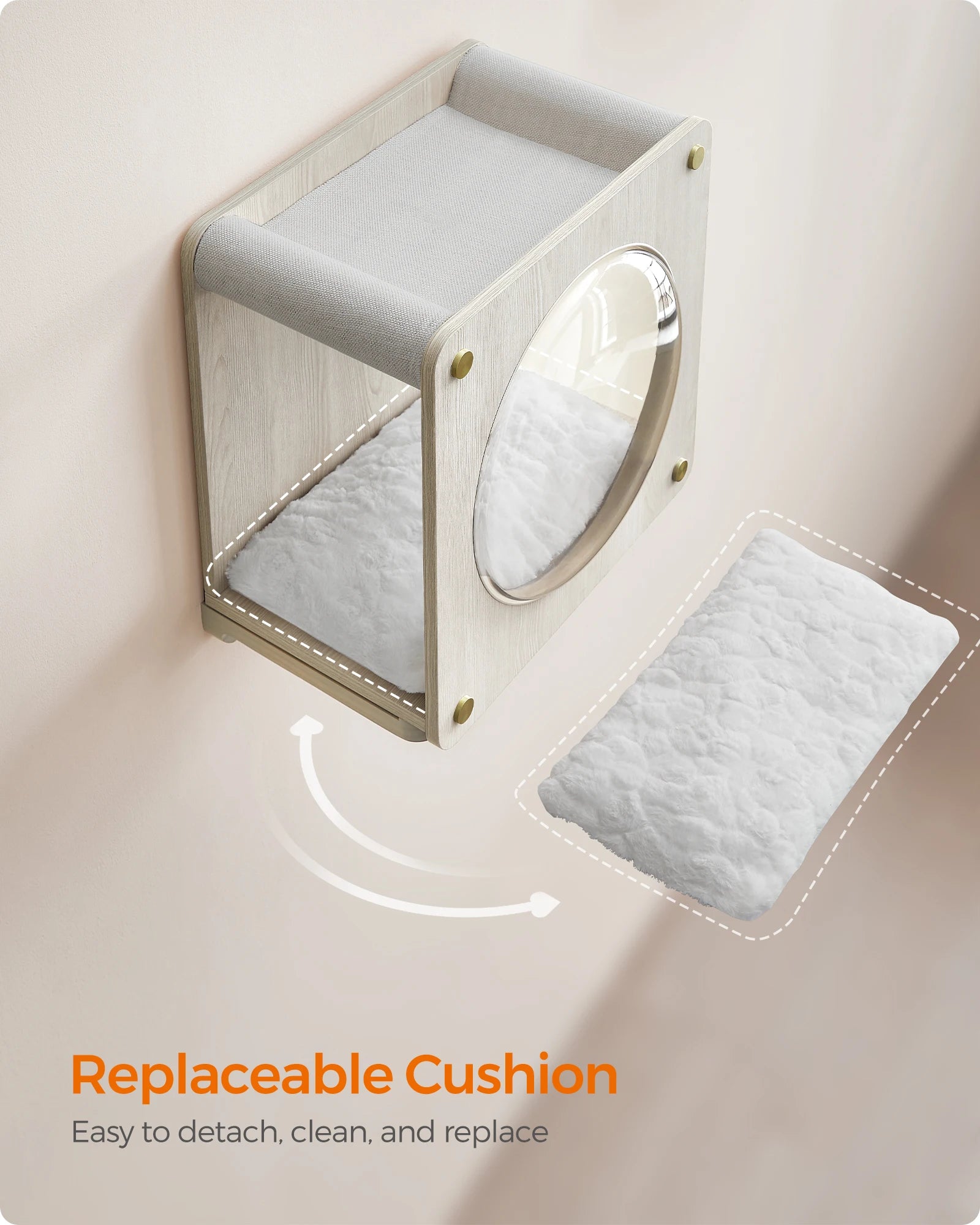 [Double Comfort] Pamper your cats with cloud-like comfort with our semi-enclosed cat perch. It comes with a 1.7" thick washable cushion for your cats to enjoy cozy naps, as well as a soft fabric hammock on top for them to leisurely lounge about